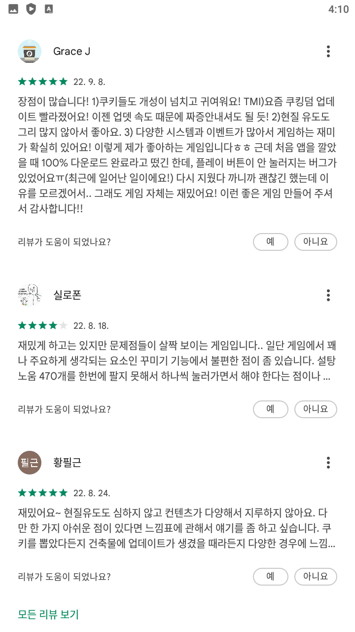 도움이 되는 리뷰 순에서 가장 많은 수를 받은 대로 정렬하여 주 사용자들의 의견을 파악 할 수 있습니다.
