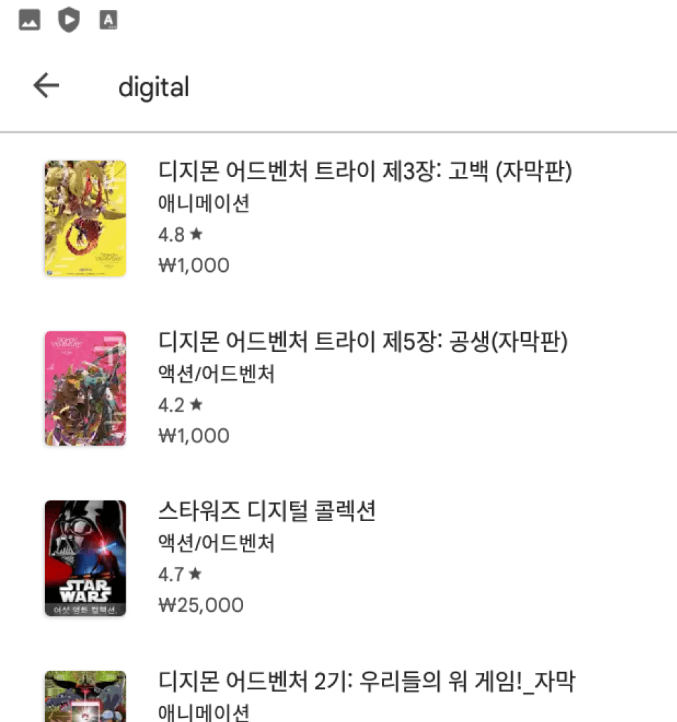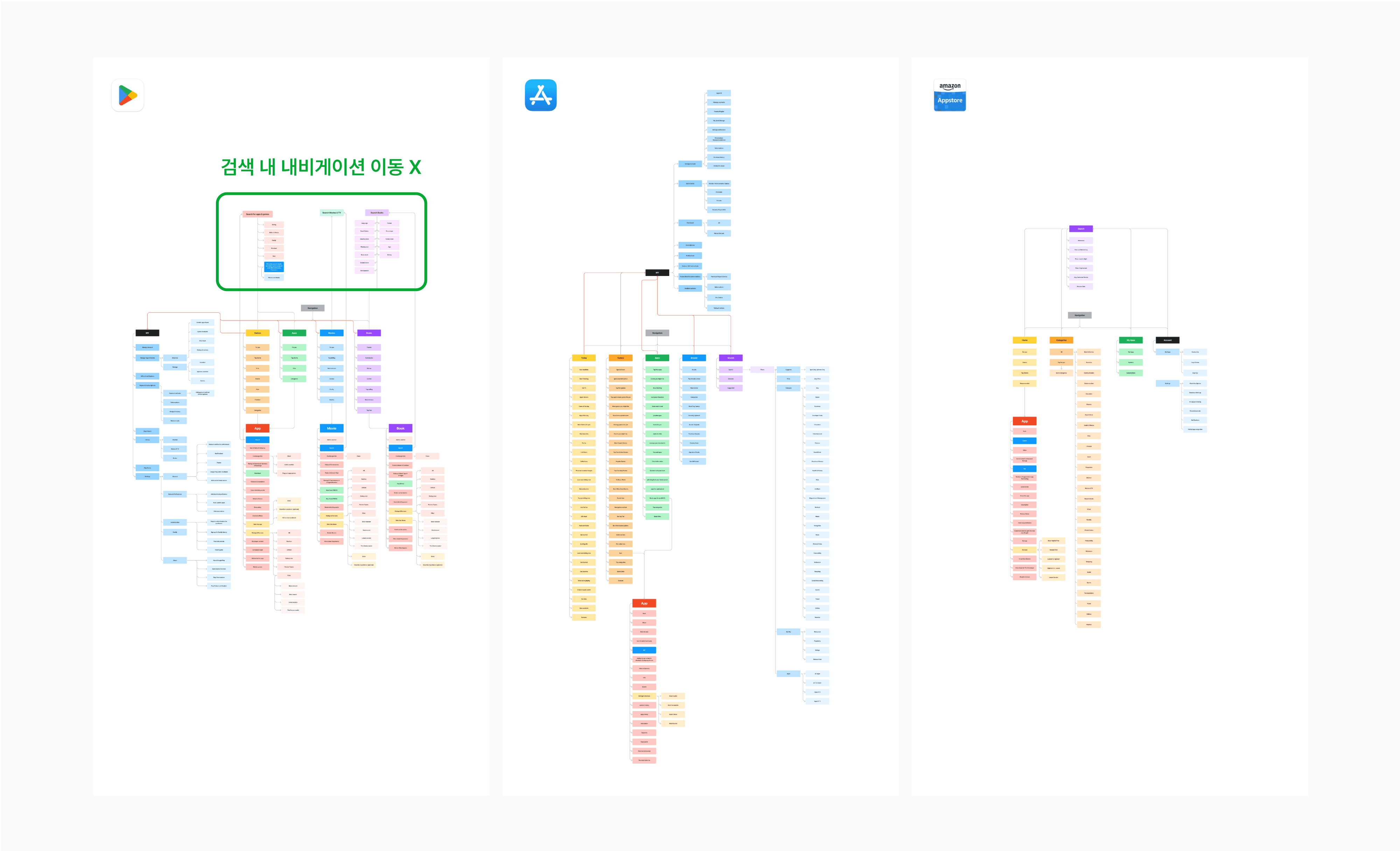구글 플레이의 경우 다른 경쟁사의 IA와 비교했을 때 검색 과정 안에서 내비게이션 이동이 불가능해 이동 수가 많아져 검색 과정이 더 복잡한 것을 알 수 있습니다.