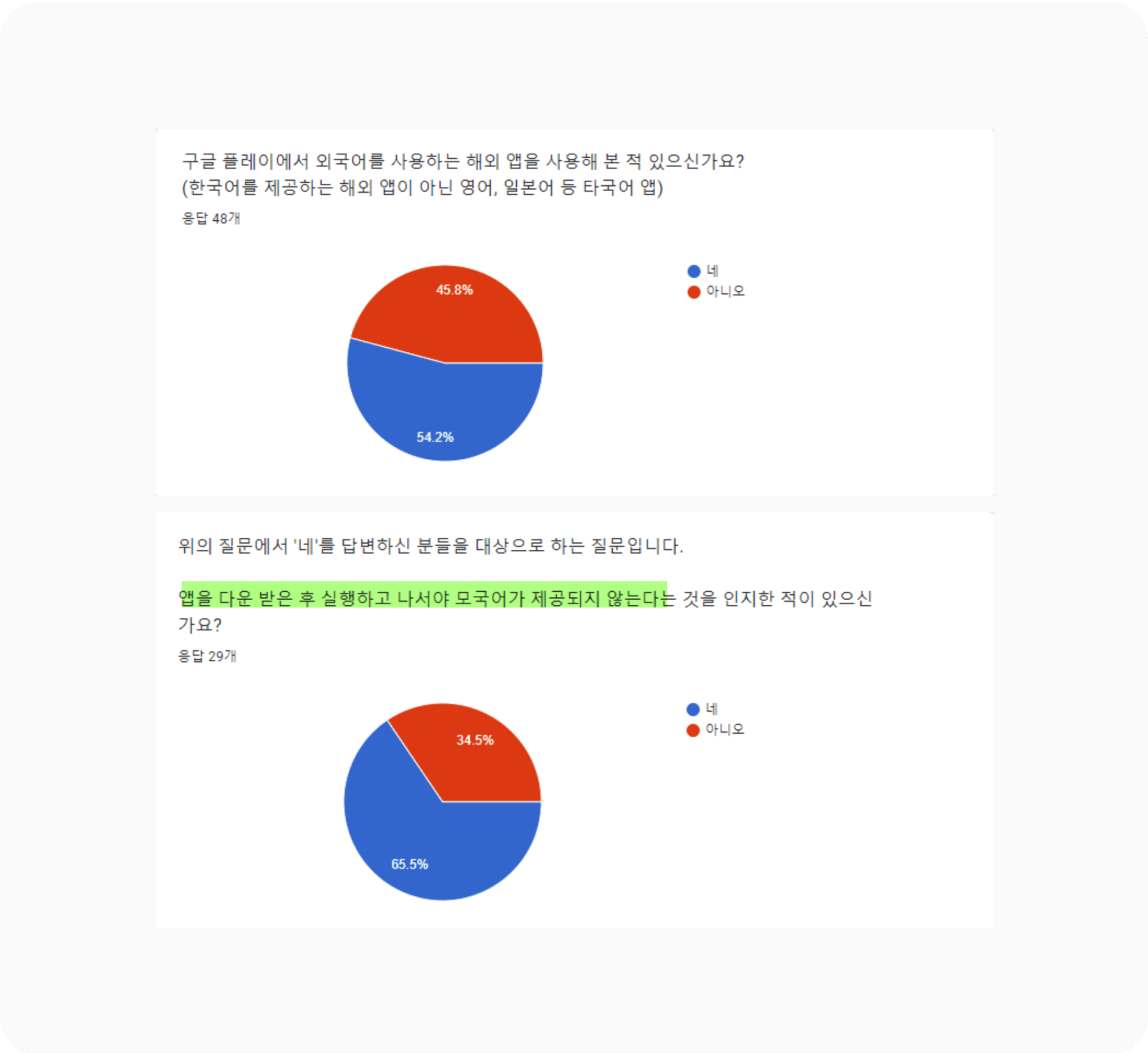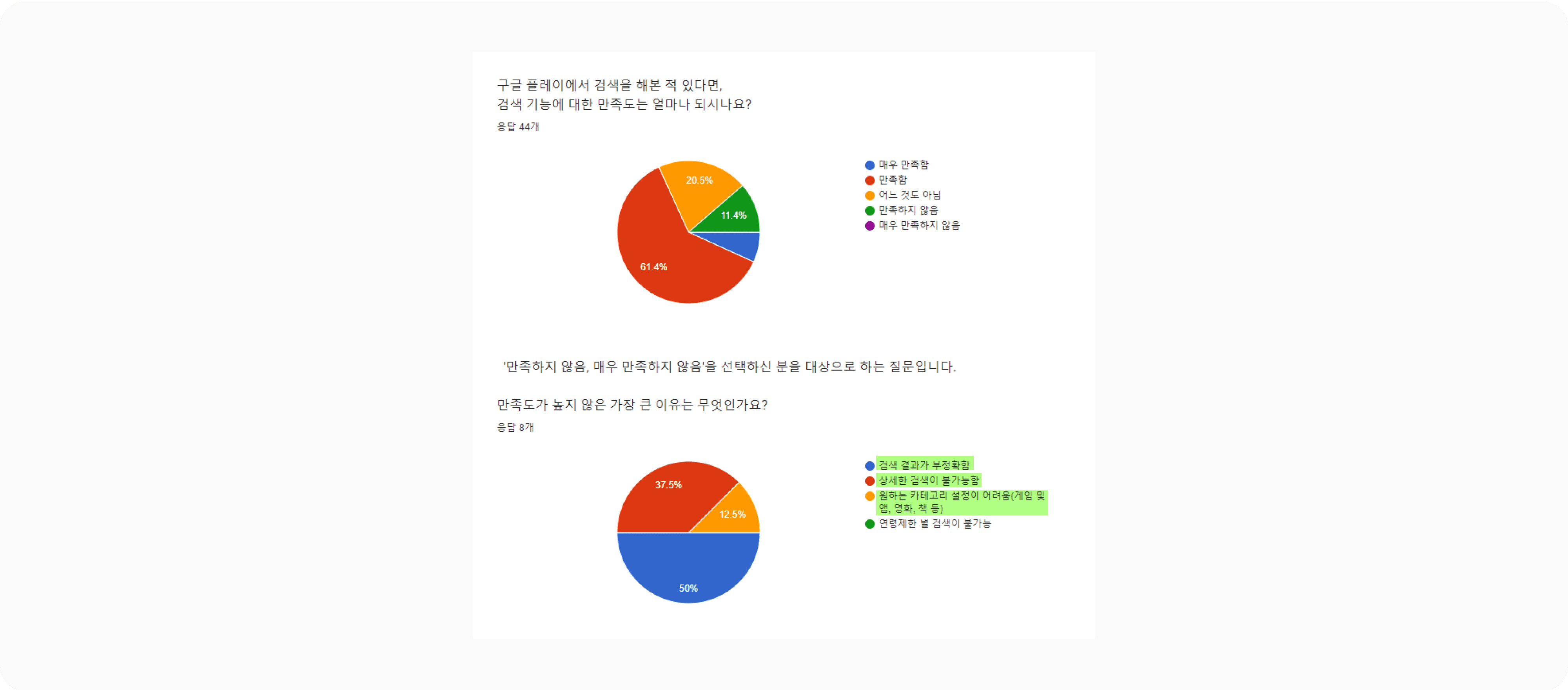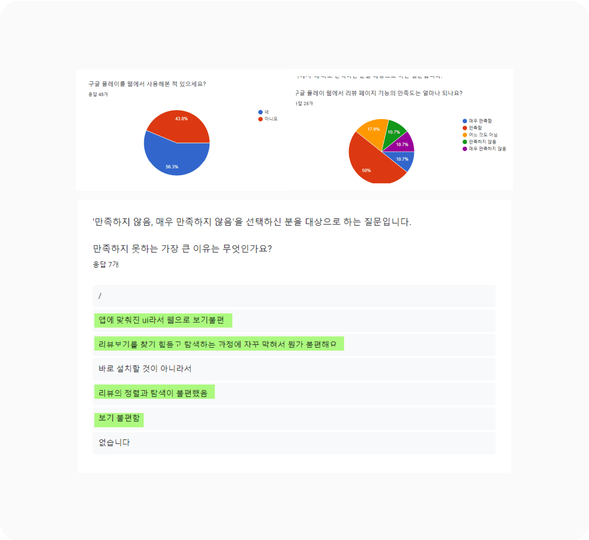 웹에서 구글 플레이를 사용해본 적 있는 사용자 중 19.4%가 만족하지 못했고, 만족하지 못하는 가장 큰 이유는 “앱에 맞춰진 UI’, “보기 불편” “정렬과 탐색 불편” 등이 있었습니다.