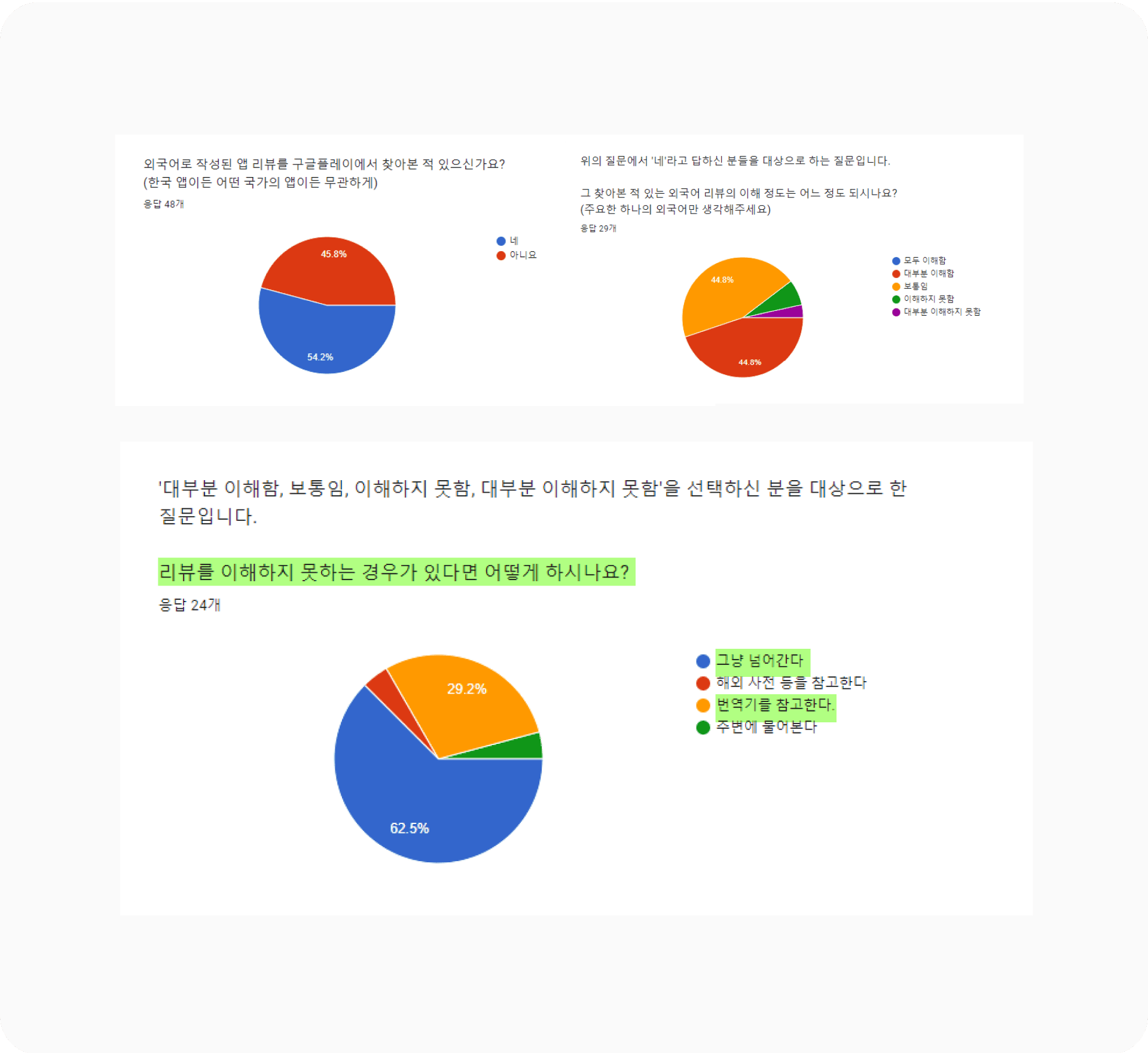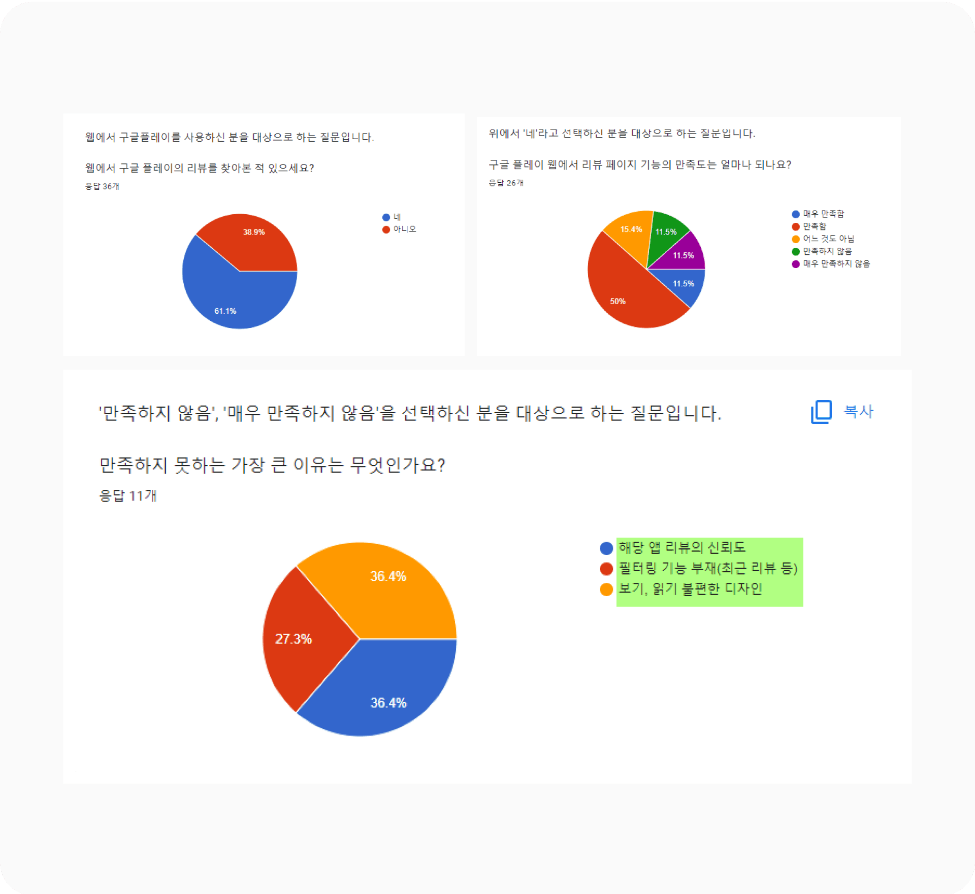 웹에서 리뷰를 찾아본 적 있는 사람 중 해당 기능에 만족하지 못하는 사용자 11.5%는 “해당 앱 신뢰도 (36.4%)”, “필터링 기능 부재 (36.4%)”, “보기 불편한 디자인 (27.3%)”를 불편한 이유로 뽑았습니다.